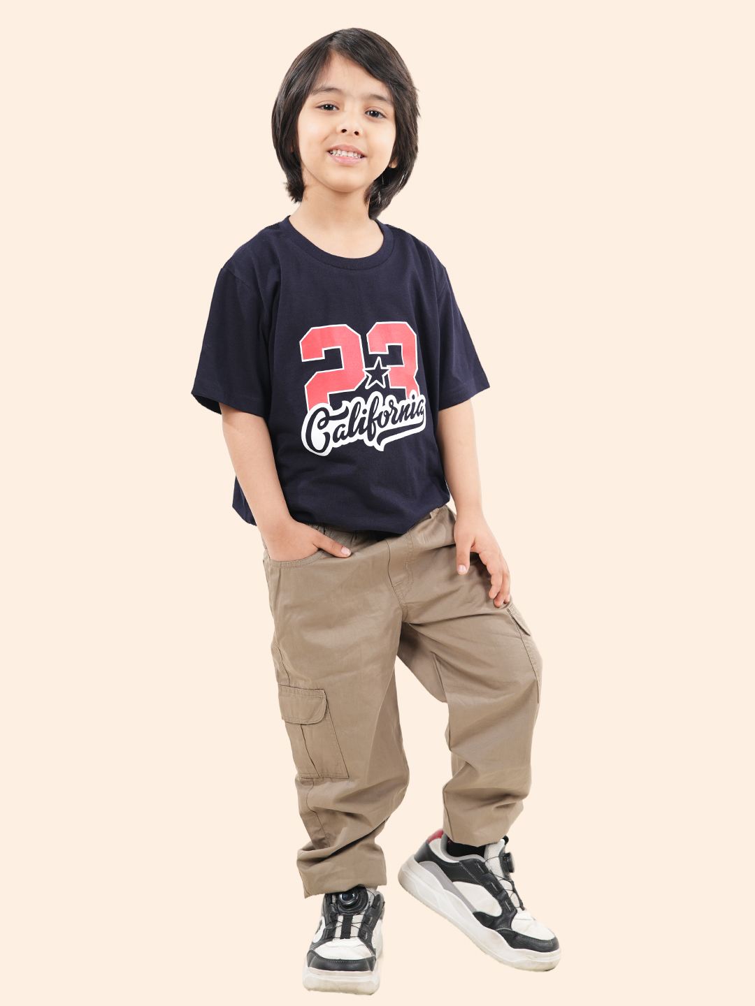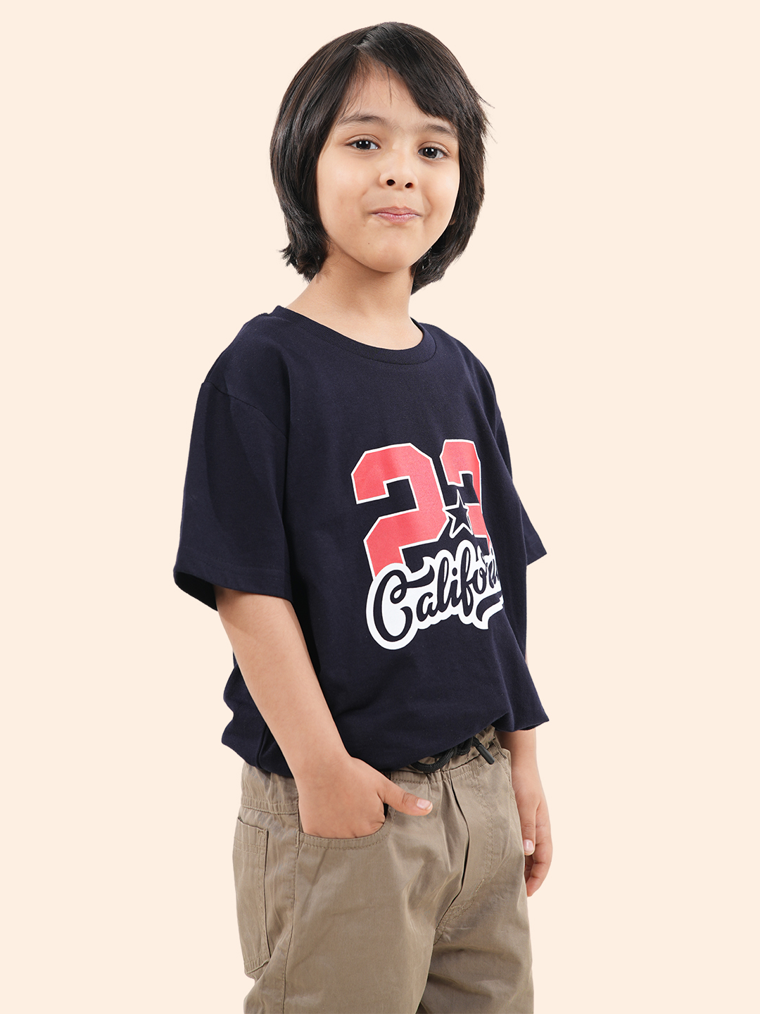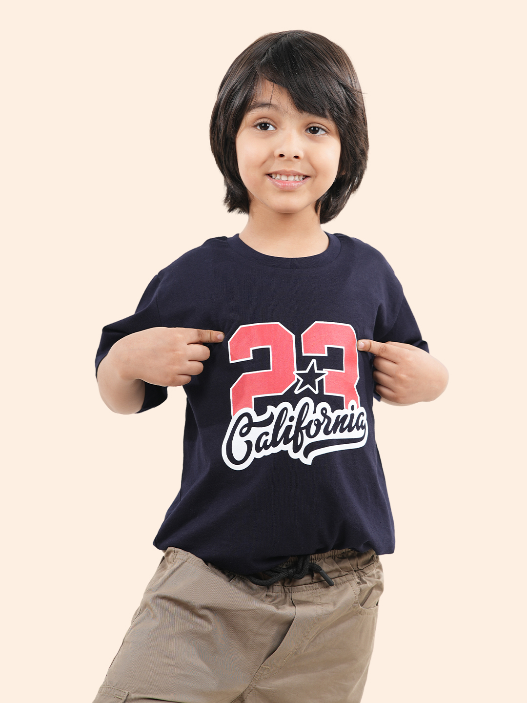 The bold 23 California design adds an athletic vibe, making this kids printed t-shirt a great choice for young trendsetters. Designed as a boys round neck t-shirt with a comfortable fit, it allows easy movement while keeping the style modern and relaxed. This boys stylish t-shirt pairs effortlessly with jeans, shorts, or joggers, making it a versatile piece for casual wear. A must-have boys fashion t-shirt, this California print t-shirt for boys blends comfort, style, and a sporty edge perfectly.