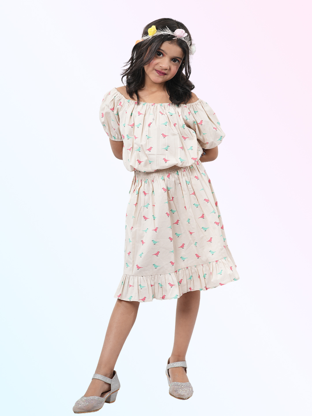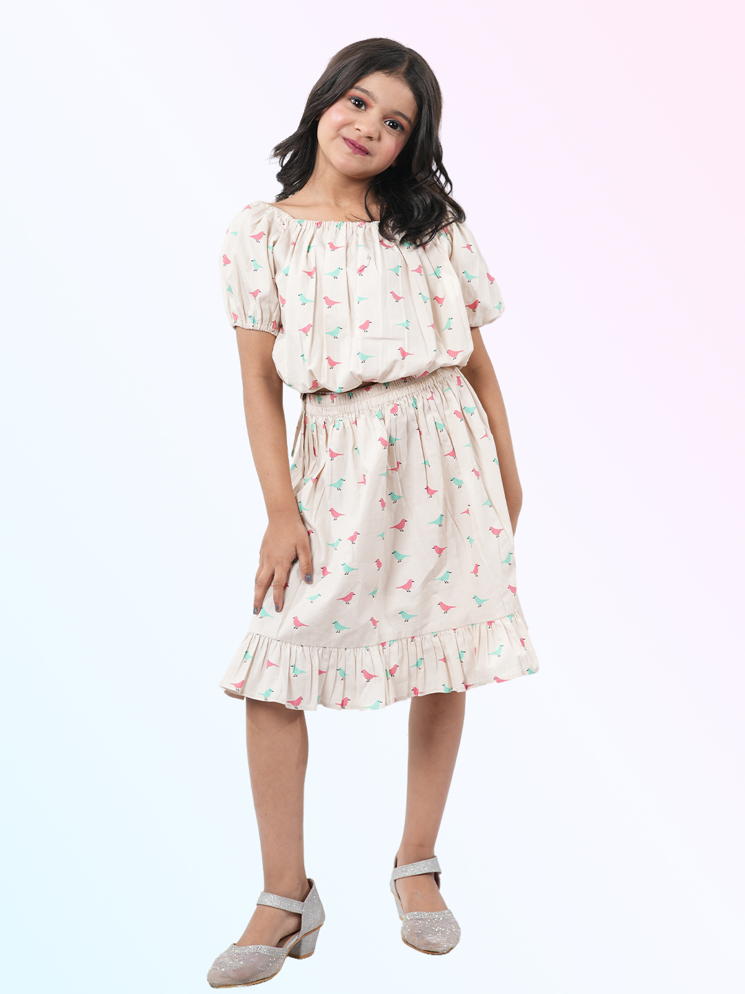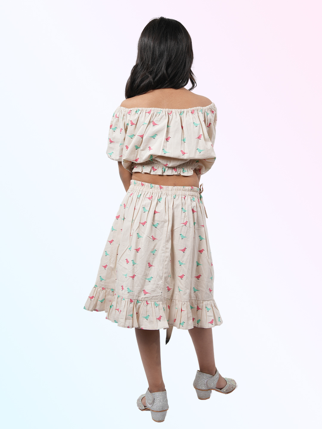 Girl's Printed Pure Cotton off-shoulder Top and Skirt Set