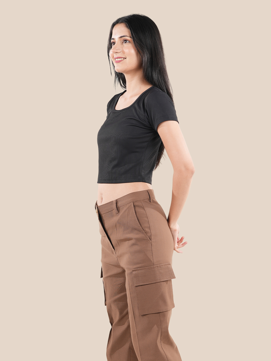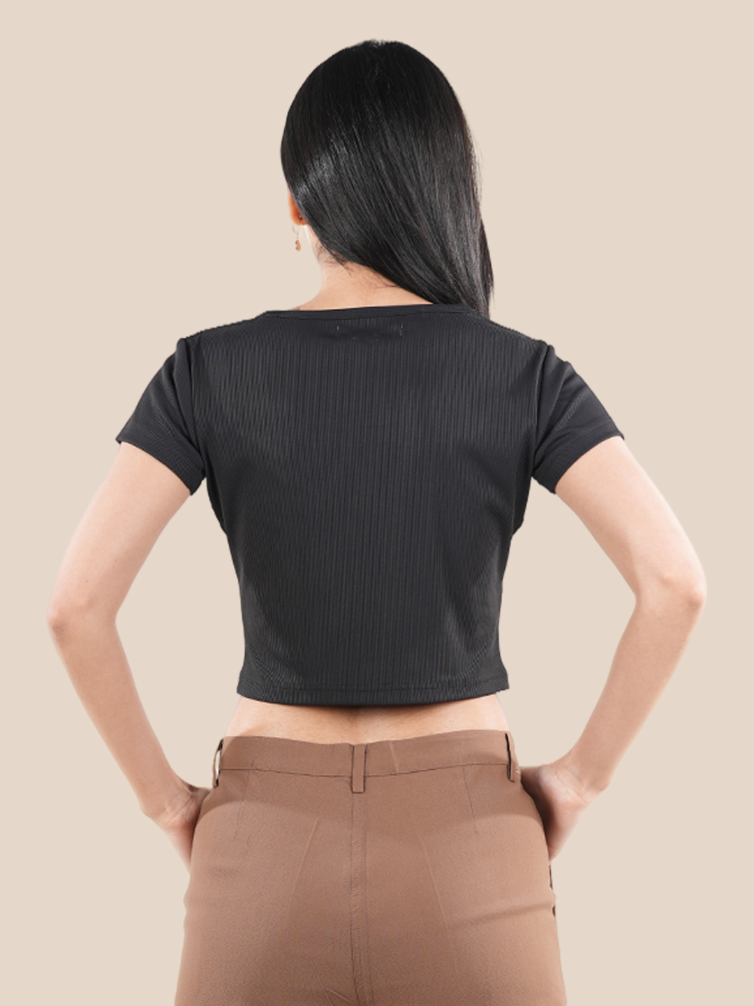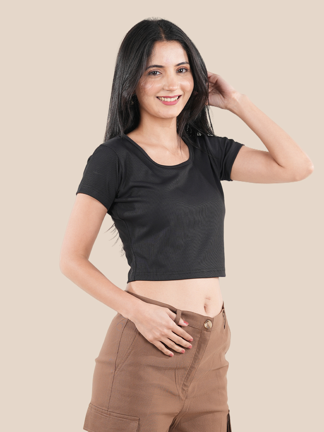 Featuring a classic round neck and short sleeves, this women`s casual crop top delivers a clean and minimal look that never goes out of style. The fitted design adds a modern touch, making this solid crop top a versatile piece for both casual and smart styling. This short sleeve crop top pairs effortlessly with high-waisted jeans, skirts, or joggers, making it a must-have for any wardrobe. A perfect women`s stylish crop top, this black crop top combines comfort, simplicity, and trend-forward appeal for everyday fashion.
