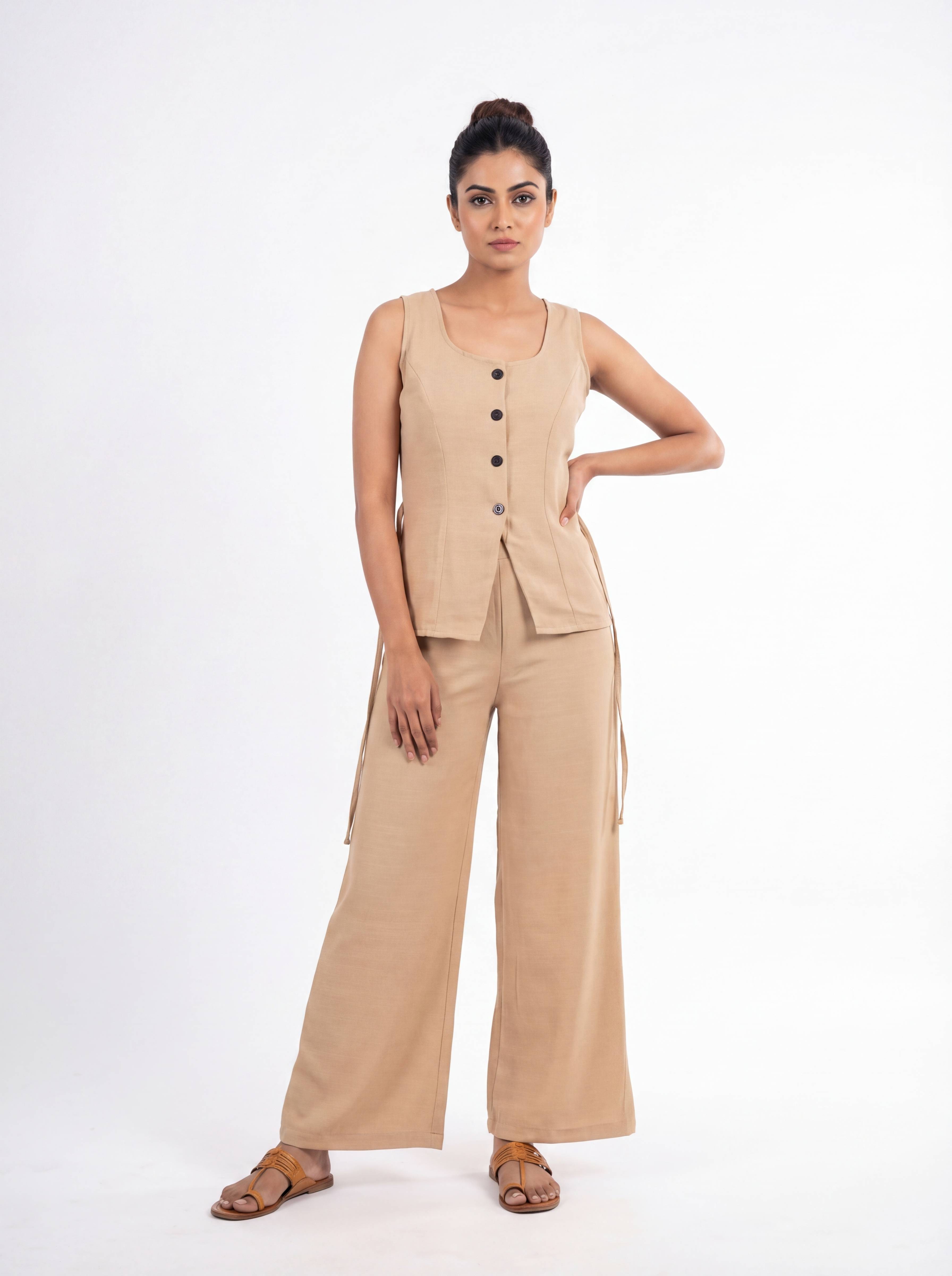 Elevate your everyday wardrobe with this effortlessly refined solid co-ord set, tailored for a clean and contemporary look. Crafted in a breathable blended fabric, this sleeveless V-neck top features a structured silhouette with front button detailing, adding a touch of minimal sophistication. Paired with relaxed wide-leg pants, the set offers both comfort and fluid movement, making it ideal for all-day wear.
